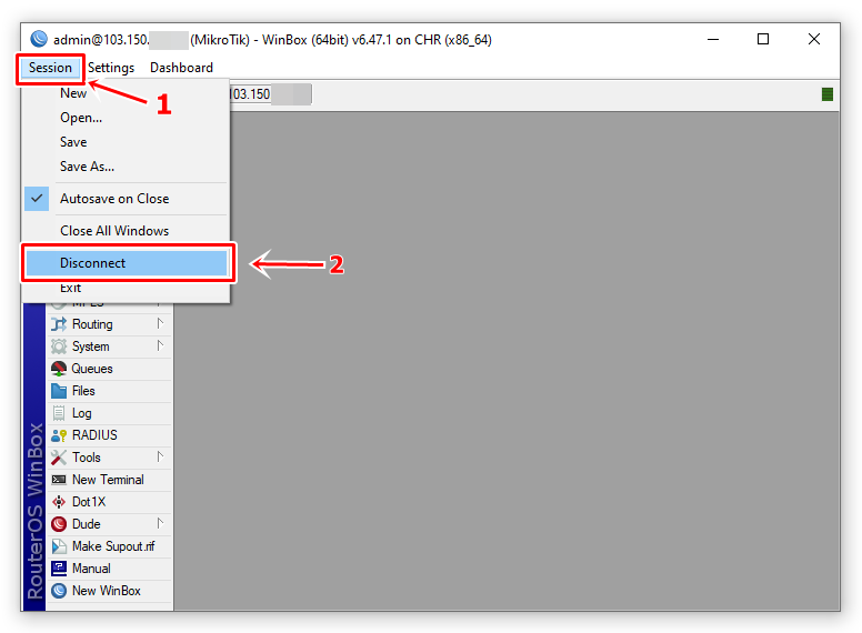 - Jika sudah selesai tahap di atas, Langkah selanjutnya adalah Klik Session dan pilih Disconnect