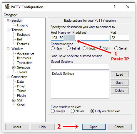 - Masukkan Ip address dan Port 22 pada Sofware Putty kemudian klik open