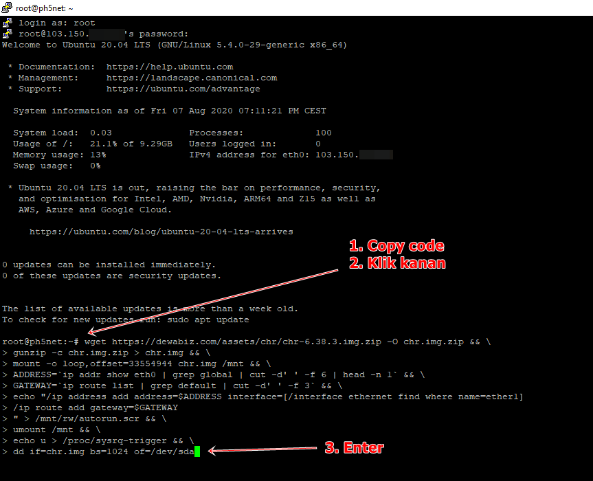 Setelah semua tahap persiapan selesai, sekarang tinggal melakukan instalasi Mikrotik di VPS. Berikut ini adalah langkah-langhak yang harus Dewabizer lakukan;