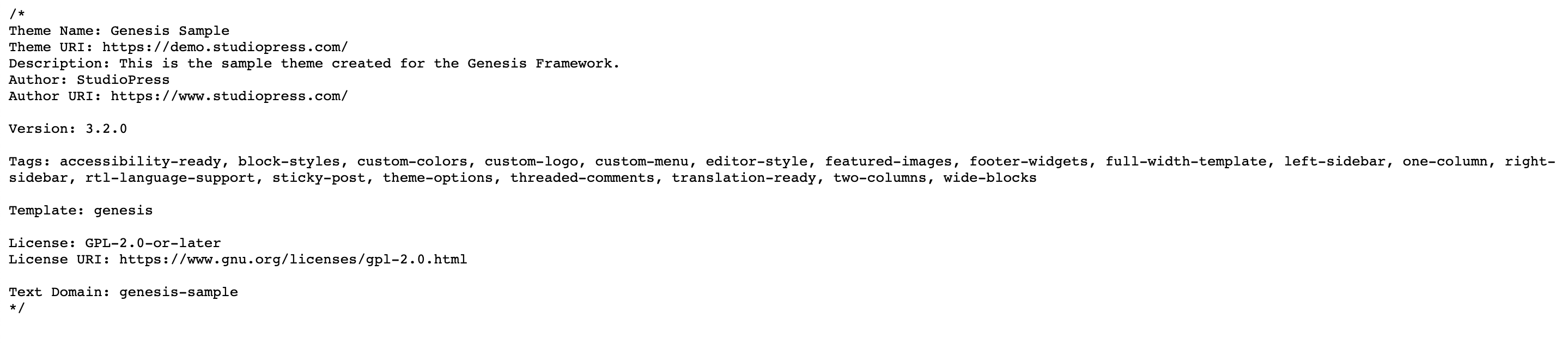 - Anda sekarang harus berada di file style dengan nama tema WordPress tepat di atas, seperti ini: