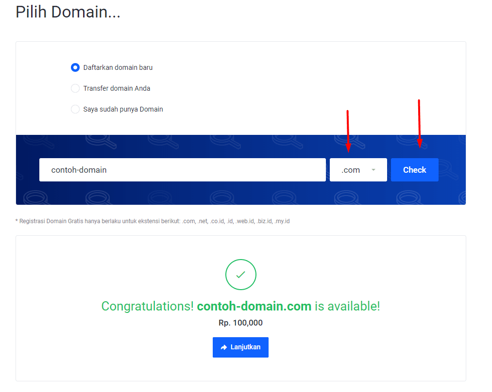 - Jika Anda ingin mendaftar domain baru, silahkan memilih opsi Daftarkan domain baru. Kemudian masukkan nama domain dan klik Check untuk mencari Domain, Setelah memilih nama domain yang tersedia, klik Lanjutkan