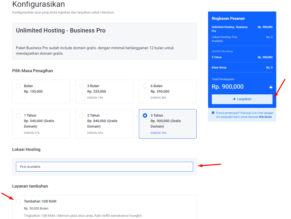 - Centang Pada layanan Tambahan, jika anda menginginkan tambahan Ram untuk hosting anda, Jika anda rasa semua telah sesuai Klik Lanjutkan