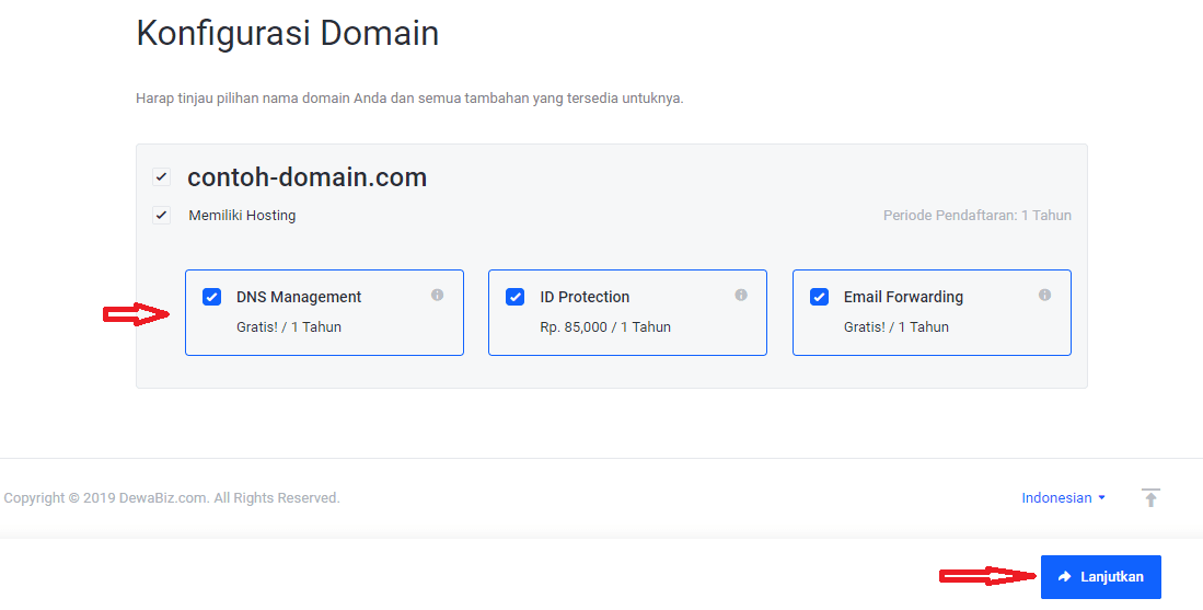 - Anda juga dapat menambahkan fasilitas tambahan seperti DNS Management, Id Protection dan Email Forwarding. Centang jika Anda ingin menambahkannya. Kemudian, klik Lanjutkan.