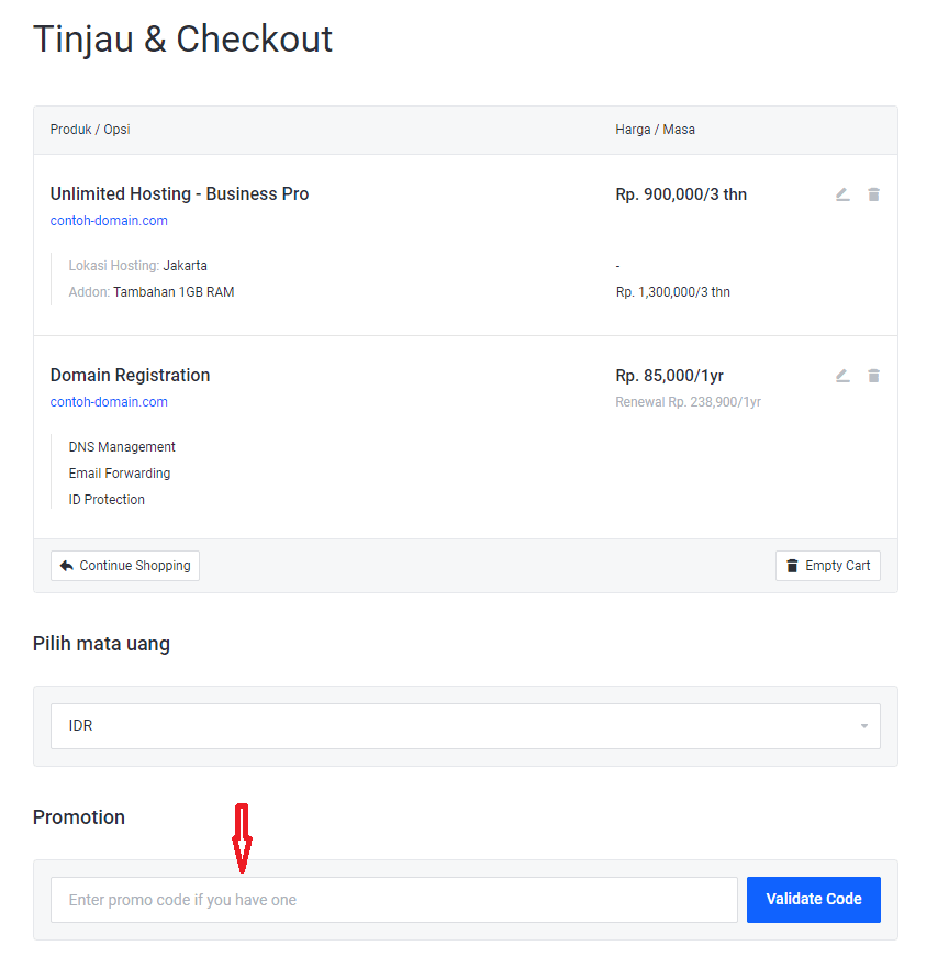 - Masukkan kode Promosi jika tersedia di bagian Validate Code untuk mendapatkan Pemotongan harga / Harga promo .
