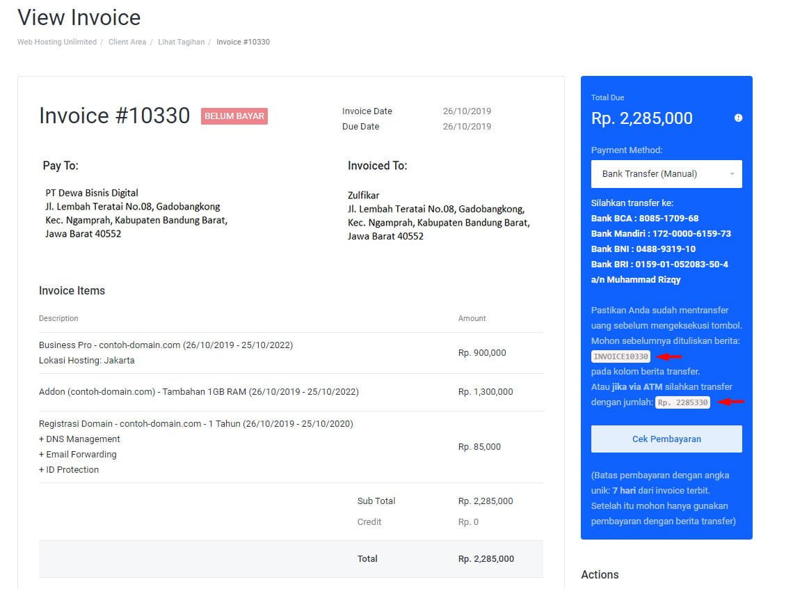 - Halaman selanjutnya akan menampilkan Invoice order layanan yang Anda lakukan, Pilih metode pembayaran yang ingin Anda gunakan dan transfer nominal sesuai dengan yang tertera pada invoice dengan kode unik dibelakangnya.
