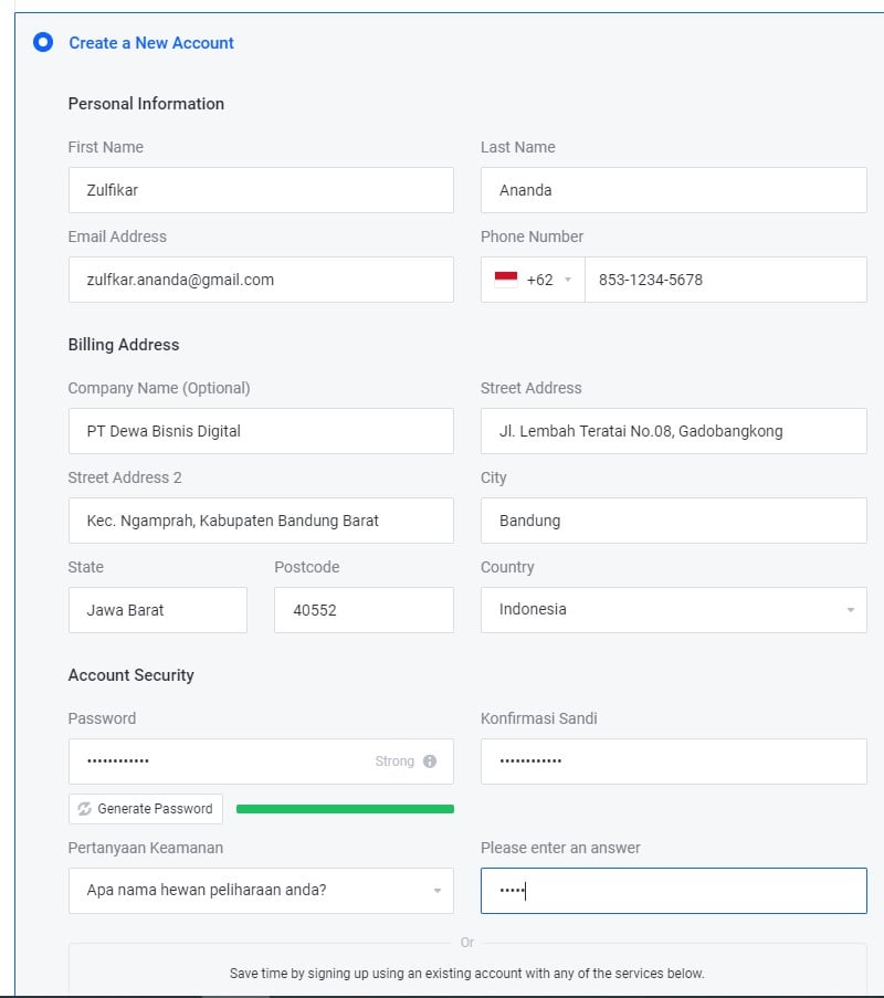 - Jika belum, klik Create a New Account dan masukkan data informasi lengkap anda untuk keperluan order layananan di dewabiz