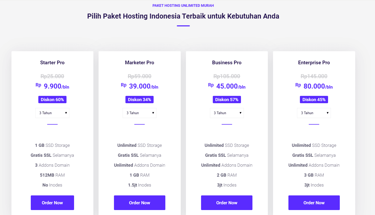 - Pilihlan masa aktif hosting pada paket yang hendak anda order, lalu Klik Order Now pada paket pilihan anda.