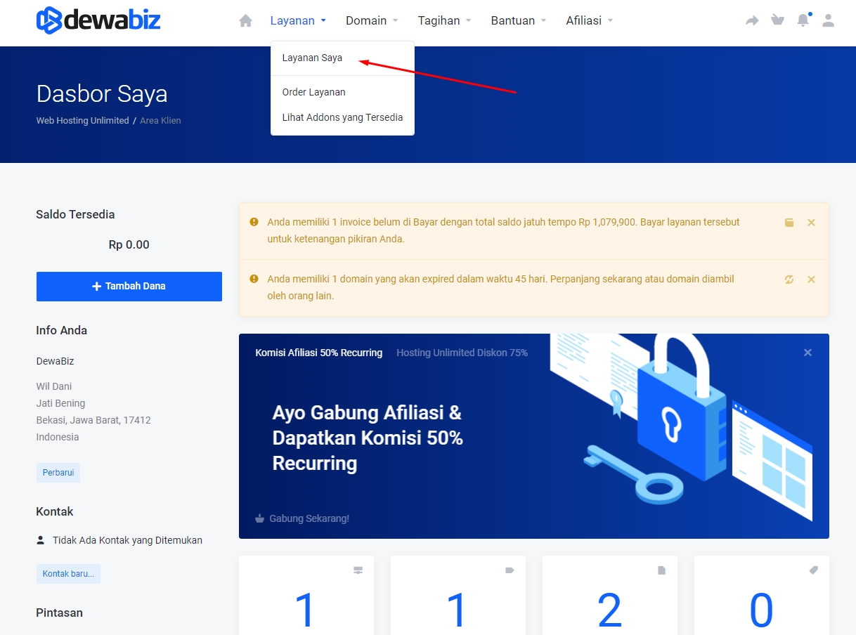 Pertama silakan log in dan masuk ke member area di DewaBiz.