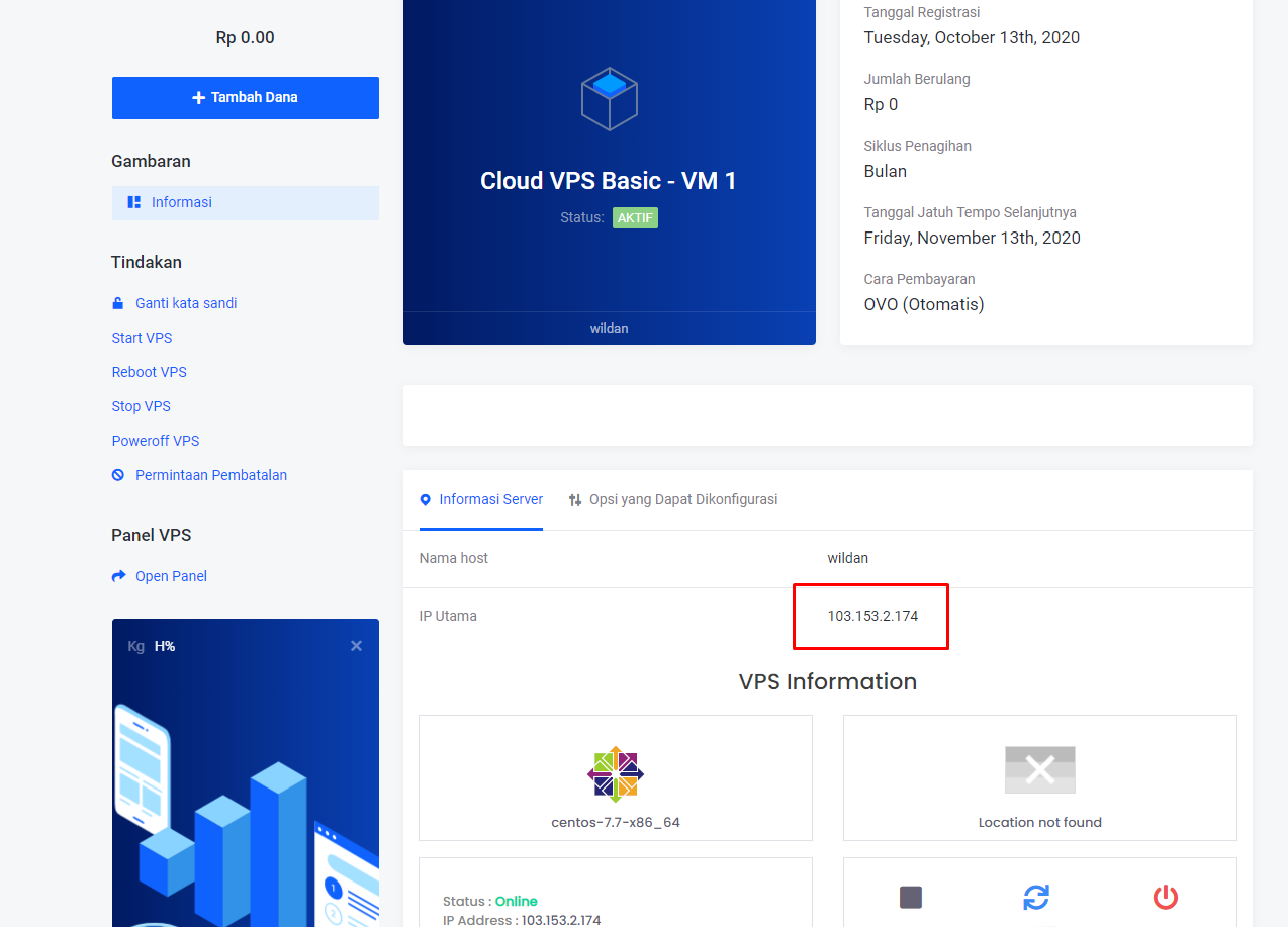 - Di dashboard VPS, temukan IP Address, lalu salin IP Address oleh Anda.