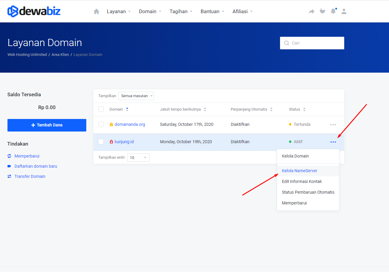 - Di bagian kanan, Anda bisa menemukan tiga dot, klik oleh Anda. Lalu klik Kelola Nameserver.