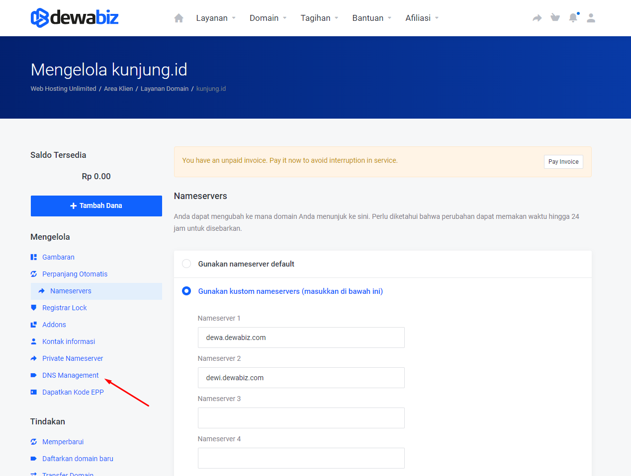 - Setelah itu klik Layanan Domain di bagian menu Domain.