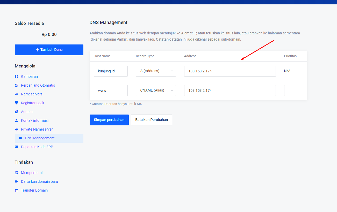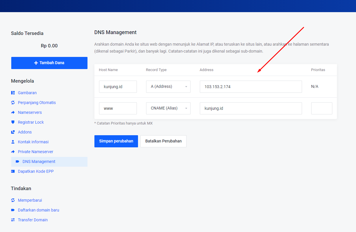 - Pertama tambahkan dulu A Record, tambahkan @ dan IP Address seperti yang terlihat di gambar. Setelah itu klik Simpan Perubahan.