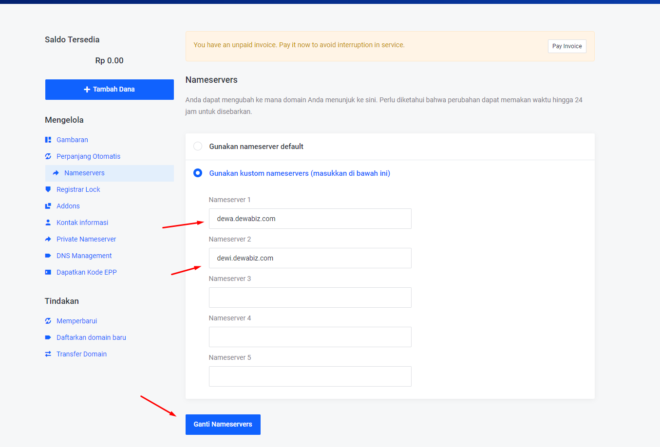 • Jika Anda ingin mengarahkan domain ke server luar, maka gunakan Kostum nameserver. Setelah Anda mengubah nameserver, tinggal klik Ganti Nameservers.