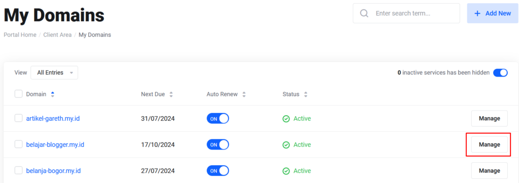 - Pilih domain, klik manage