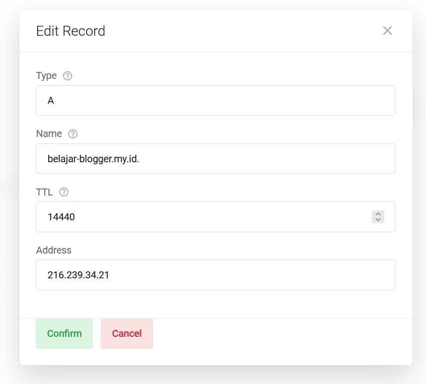 Untuk pengisian dengan IP 216.239.32.21 tidak peru di tambahkan karena sudah di tambahan, untuk menambahkan record bisa klik add record, pilih type A , name dengan nama domain, TTL 14440 dan address A record blogger, jika sudah silahkan confirm.