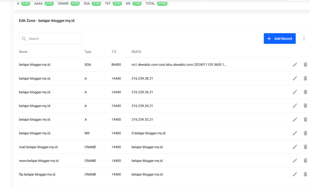 Silahkan tambahan record untuk blogger dari A record sampai CNAME
