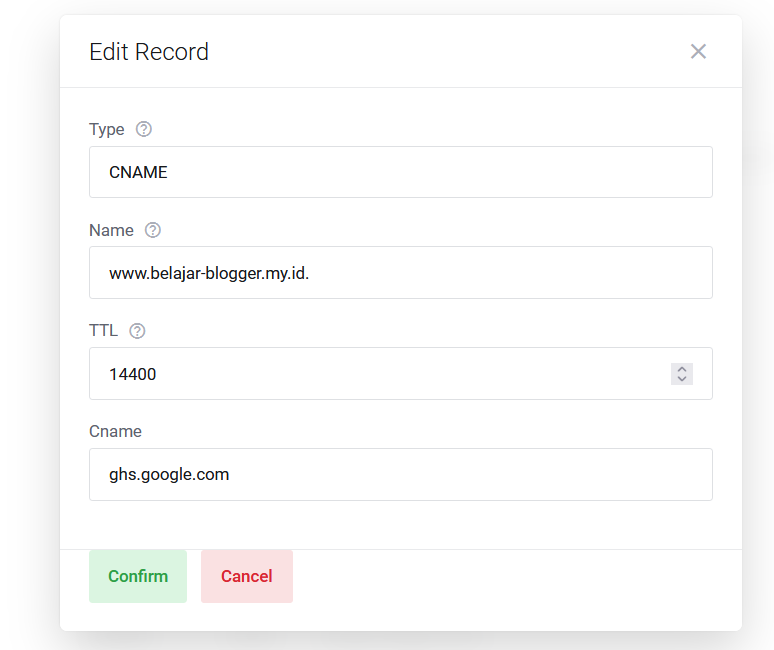 - Silahkan edit record menjadi ghs.google.com jika sudah silahkan klik confirm