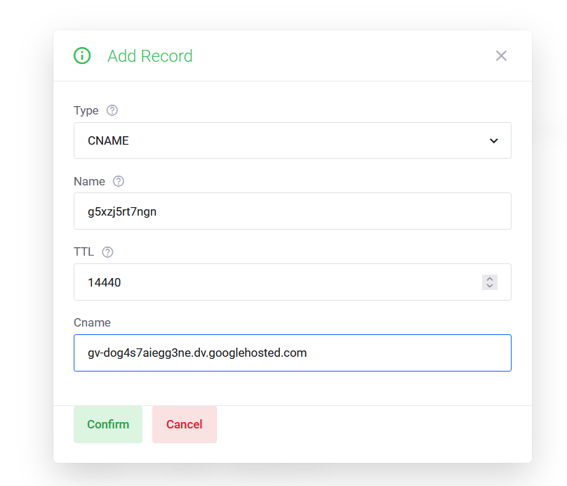 - Untuk yang kedua tambahan kode yang diberikan blogspot. untuk hostname g5xzj5rt7ngn, TTL isi dengan 1440, type cname dan address/value di isi dengan gv-dog4s7aiegg3ne.dv.googlehosted.com jika sudah silahkan klik confirm