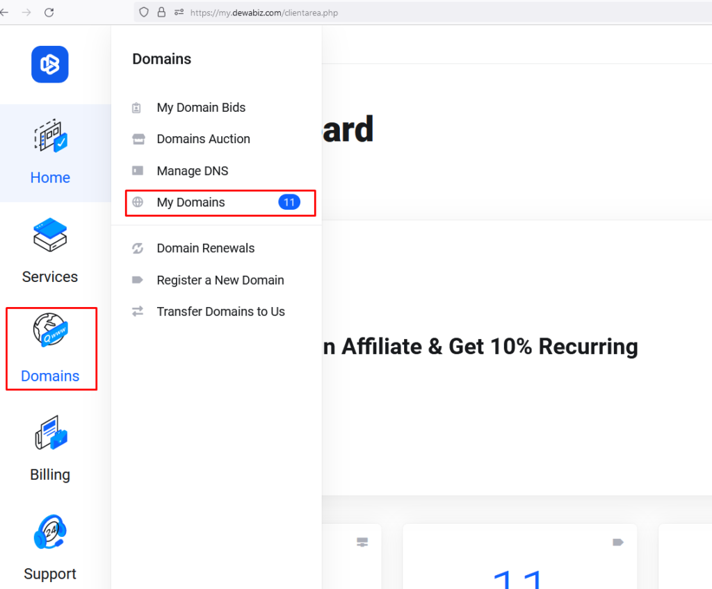 - Pilih menu domain kemudian layanan domain
