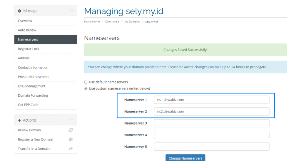 Lalu isi dengan nameserver ns1.dewabiz.com dan ns2.dewabiz.com dan jika sudah selesai klik change nameserver