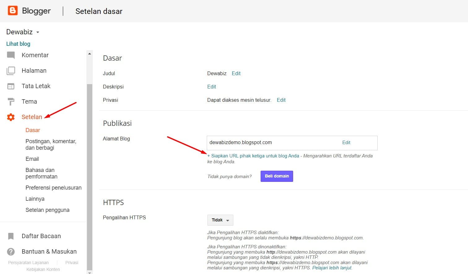 Namun, setelah website dibuat menggunakan blogspot tentunya alamat website anda masih menggunakan embel-embel [dot] blogspot.com, misal : dewabiz.blogspot.com tentunya dengan adanya embel-embel tersebut terlihat terlalu umum dan kurang keren bukan ?