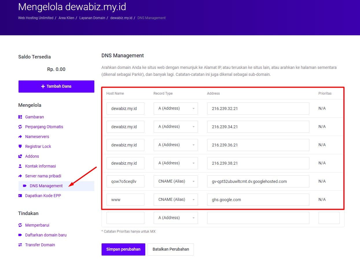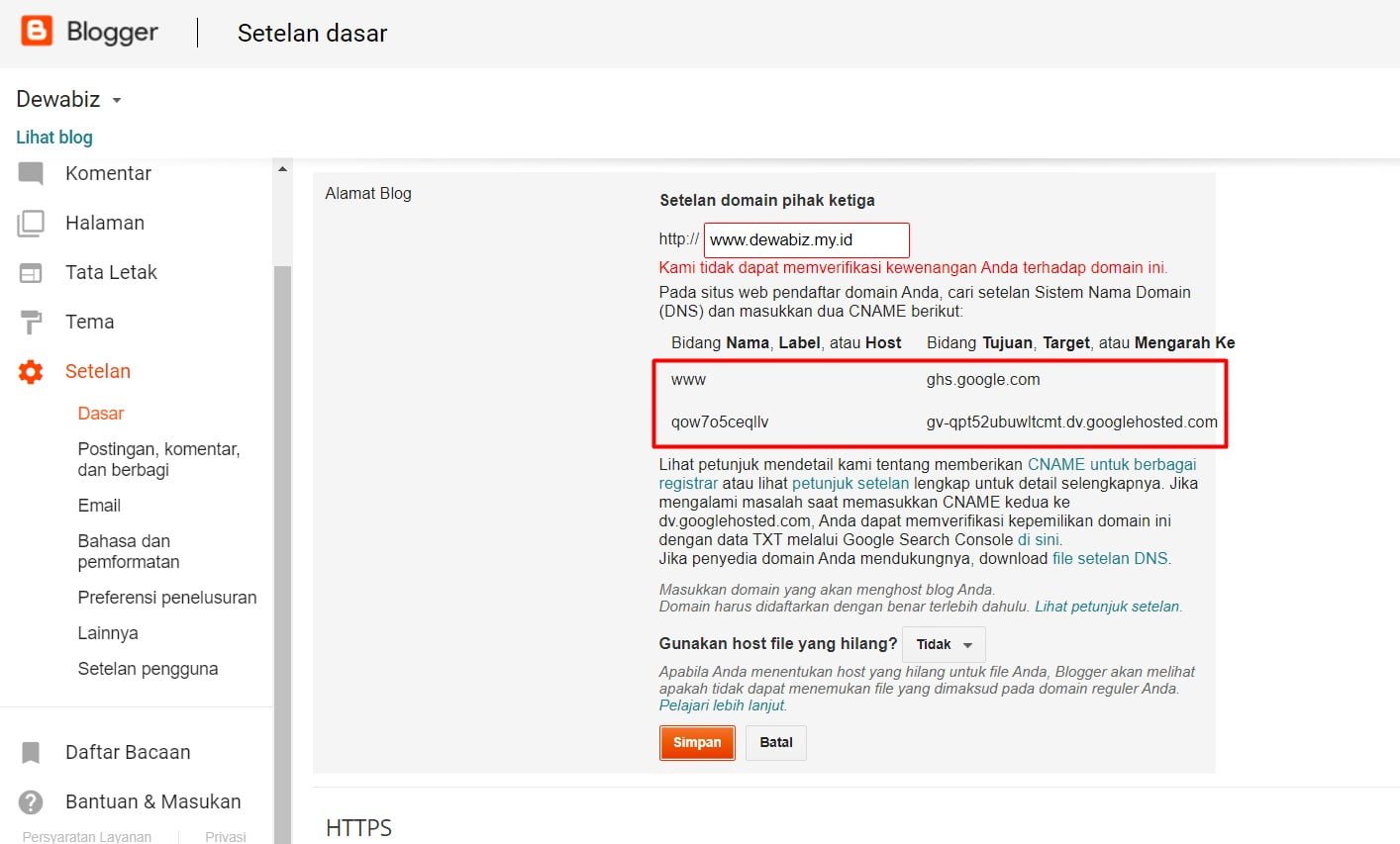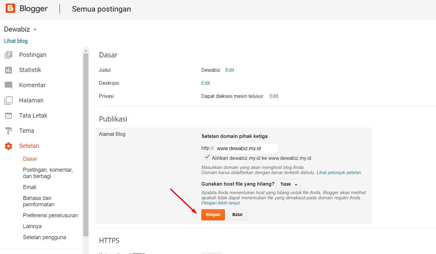 - Isikan kolom blog domain dengan nama domain anda, Misalkan nama domain anda dewabiz.my.id, maka cara mengisinya www.dewabiz.my.id kemudian klik “Simpan” .