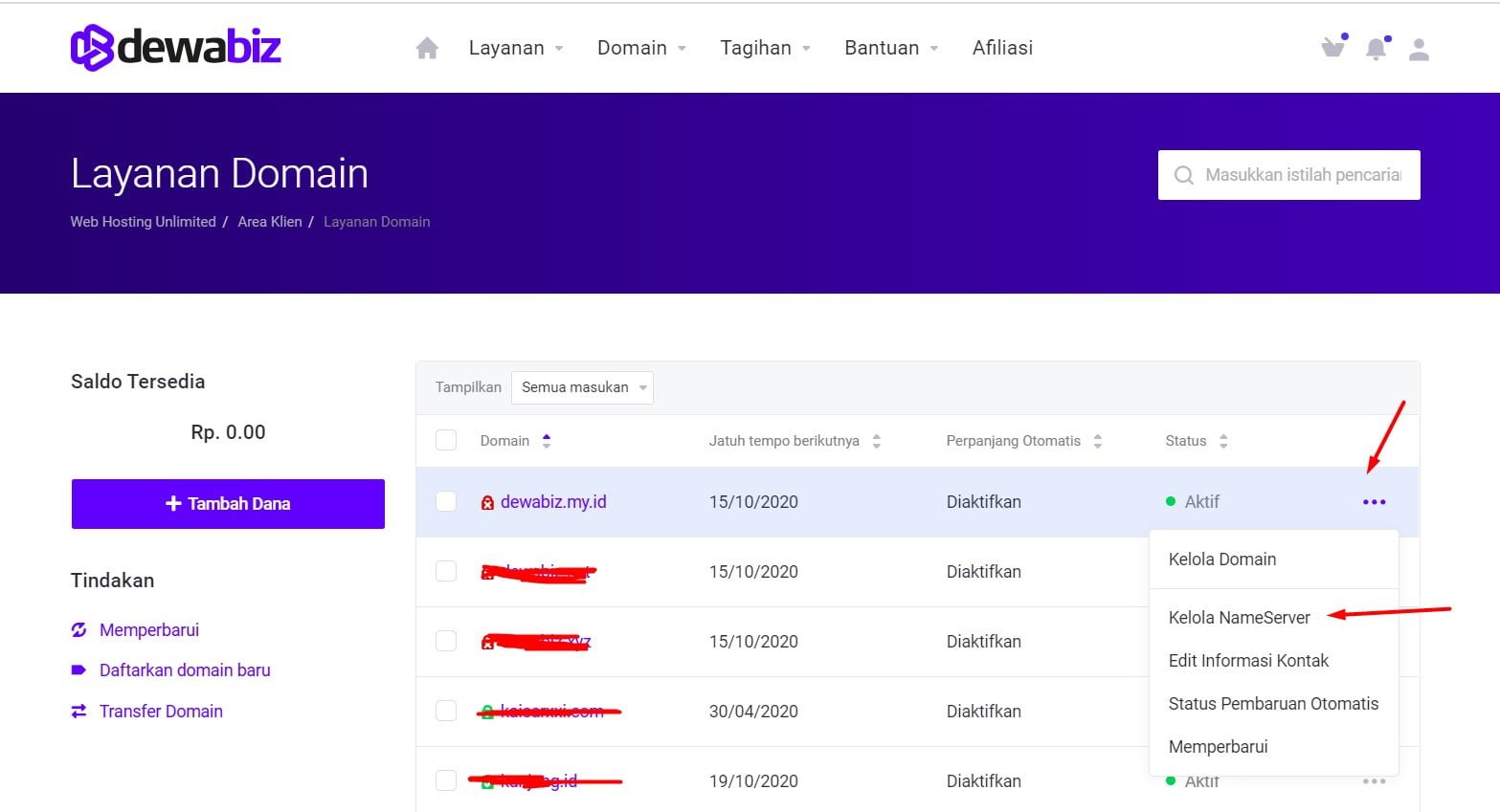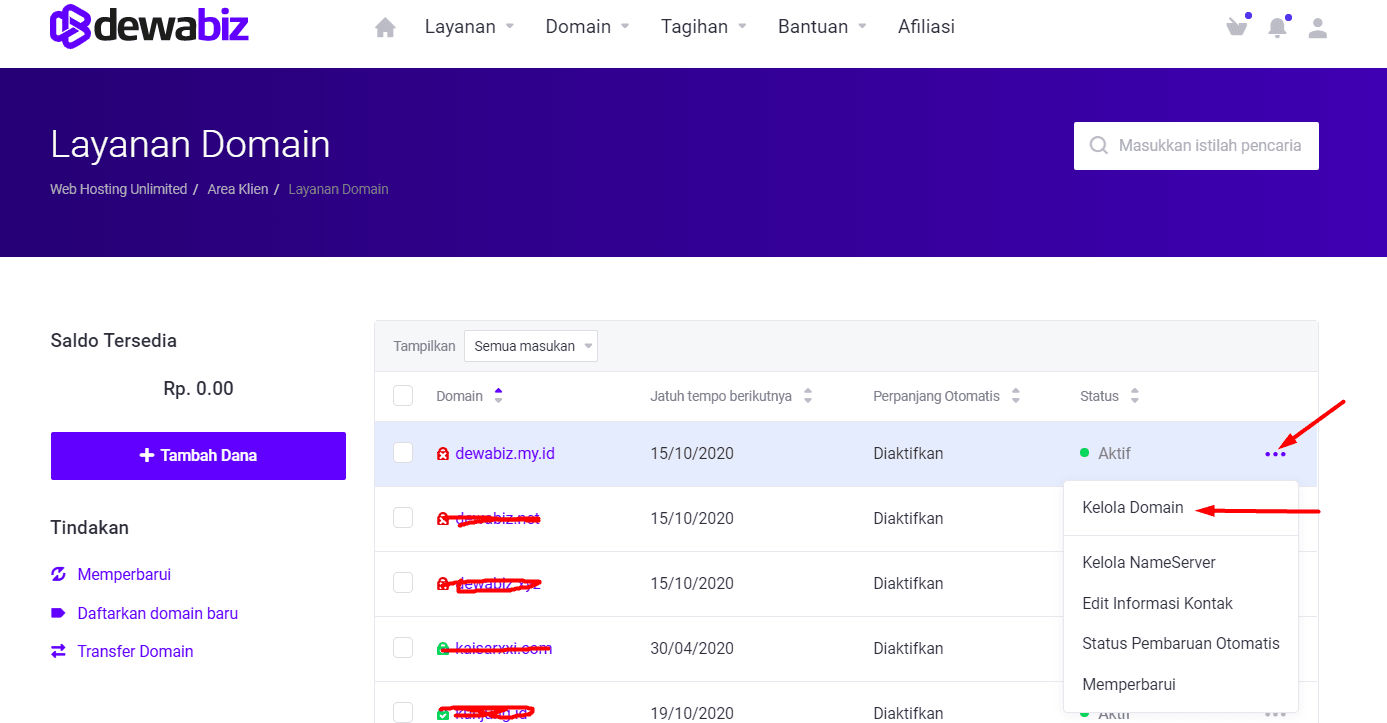 - Langkah selanjutnya, Login ke client area, klik domain > klik titik 3 pada nama domain yang ingin di setting kemudian klik lelola domain, seperti gambar berikut :