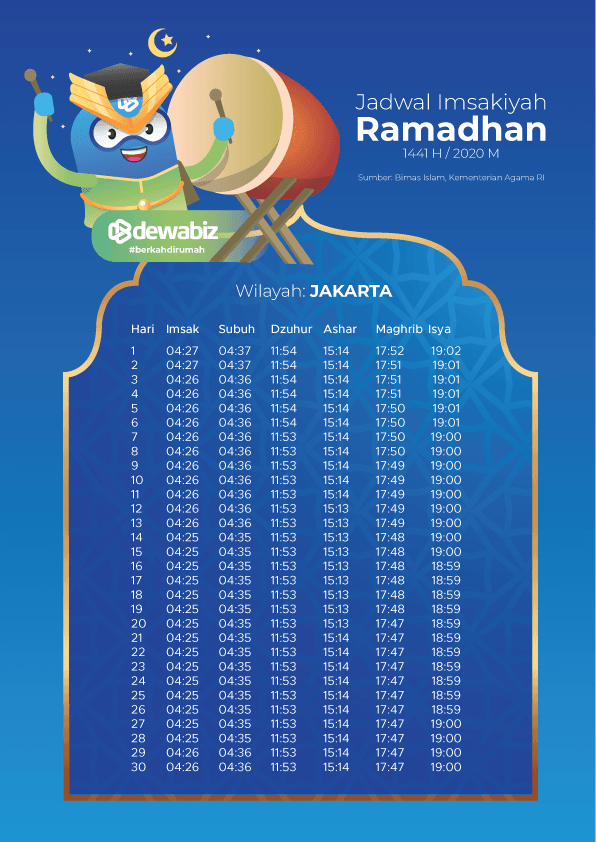 Dewabiz menyiapkan Jadwal Imsakiyah untuk Kota Jakarta untuk menunjang kelancaran ibadah puasa Ramadhan. Berikut Jadwal Imsakiyah Untuk Kota Jakarta dan sekitarnya :